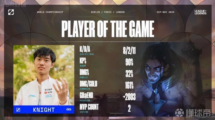 第31分钟,HLE趁Bin回家的时机拿下小龙,后续团战Knight一路追击HLE众人,BLG打出0换4顺势拿下大龙,15-6。