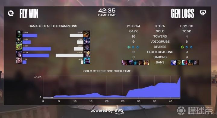 第42分钟,FLY拿下大龙,后续团战,Quad四杀收尾,FLY打出0换5团灭GEN拿下赛点,8-21。